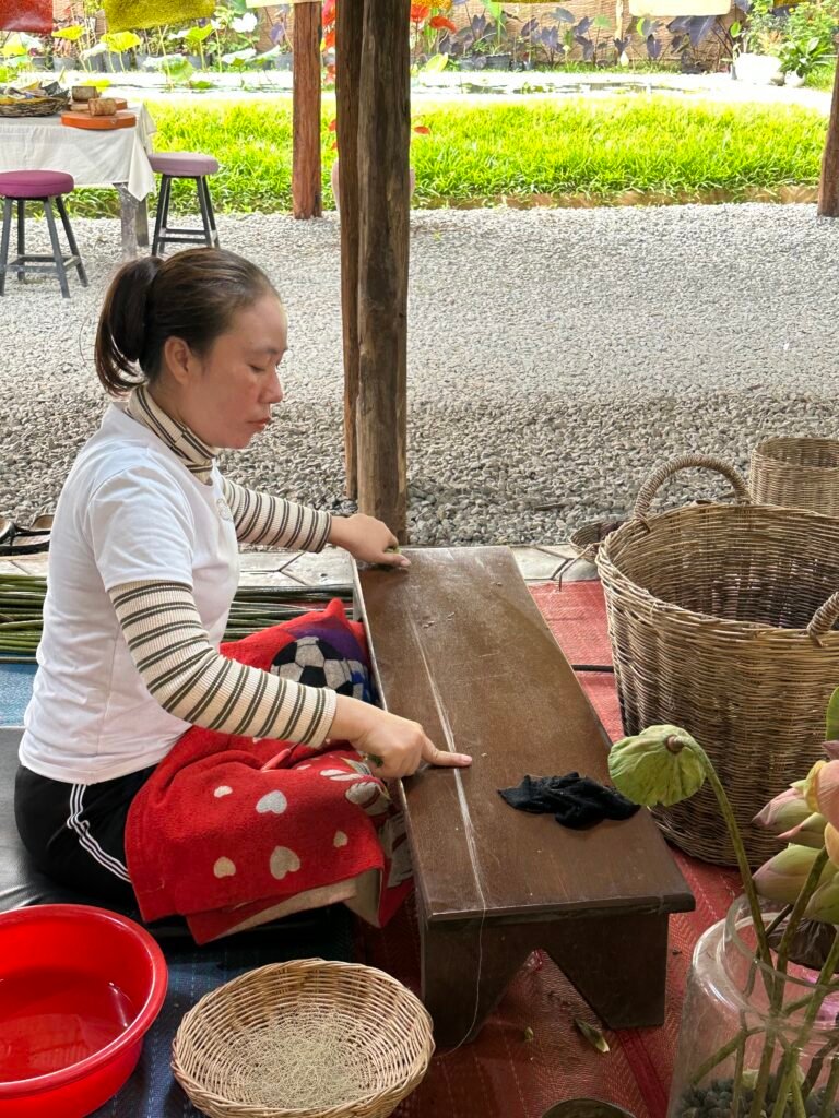 - Fiber Extraction: Artisans grip the stems and gently pull, revealing thin, sticky fibers. Each stem yields only a tiny amount of fiber, making the process extremely time-consuming.