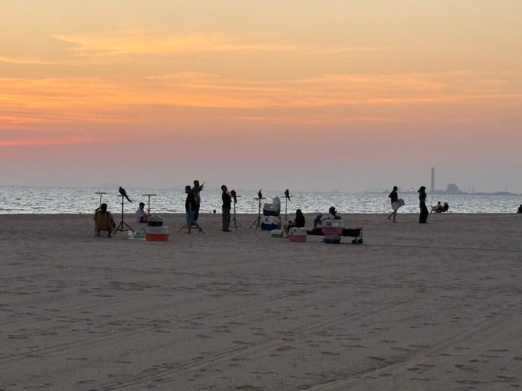 On the first night we headed down to the beach road area which was a nice ride up and down. (The great thing about Thailand is I can hire scooters everywhere, legally.) We stopped and watched the sunset which was really good, and a parrot club letting their parrots out for a fly. There must have been at least six parrots out with their owners for a fly around the beach. Other than that the beach was quite quiet.